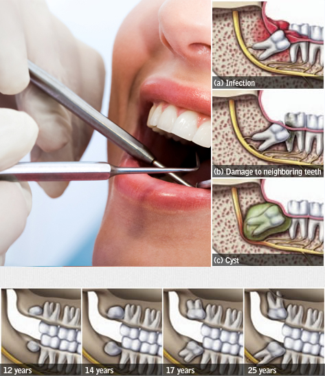 If left in the mouth, impacted wisdom teeth may damage neighboring teeth, or become infected. Because the third molar area of the mouth is difficult to clean, it is a site that invites the bacteria that leads to gum disease. Furthermore oral bacteria may travel from your mouth through the bloodstream, where it may lead to possible systemic infections and illnesses that affect the heart, kidneys and other organs.